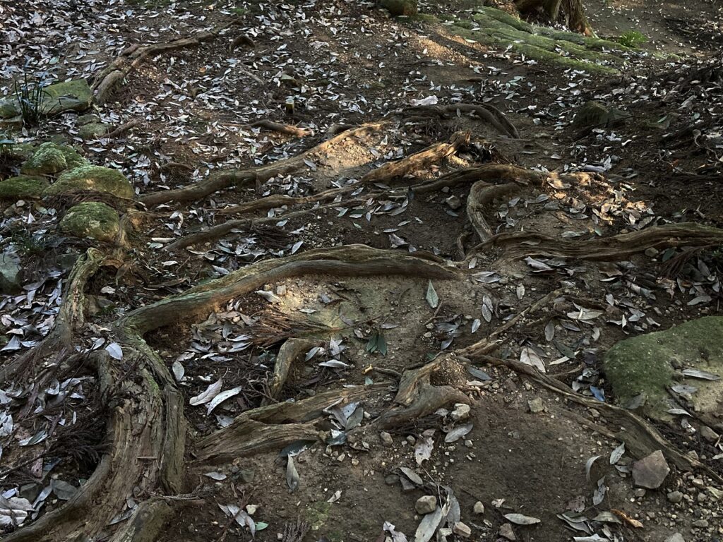 日の当たる石段を一歩一歩あゆんだ先は苔生した石段がある