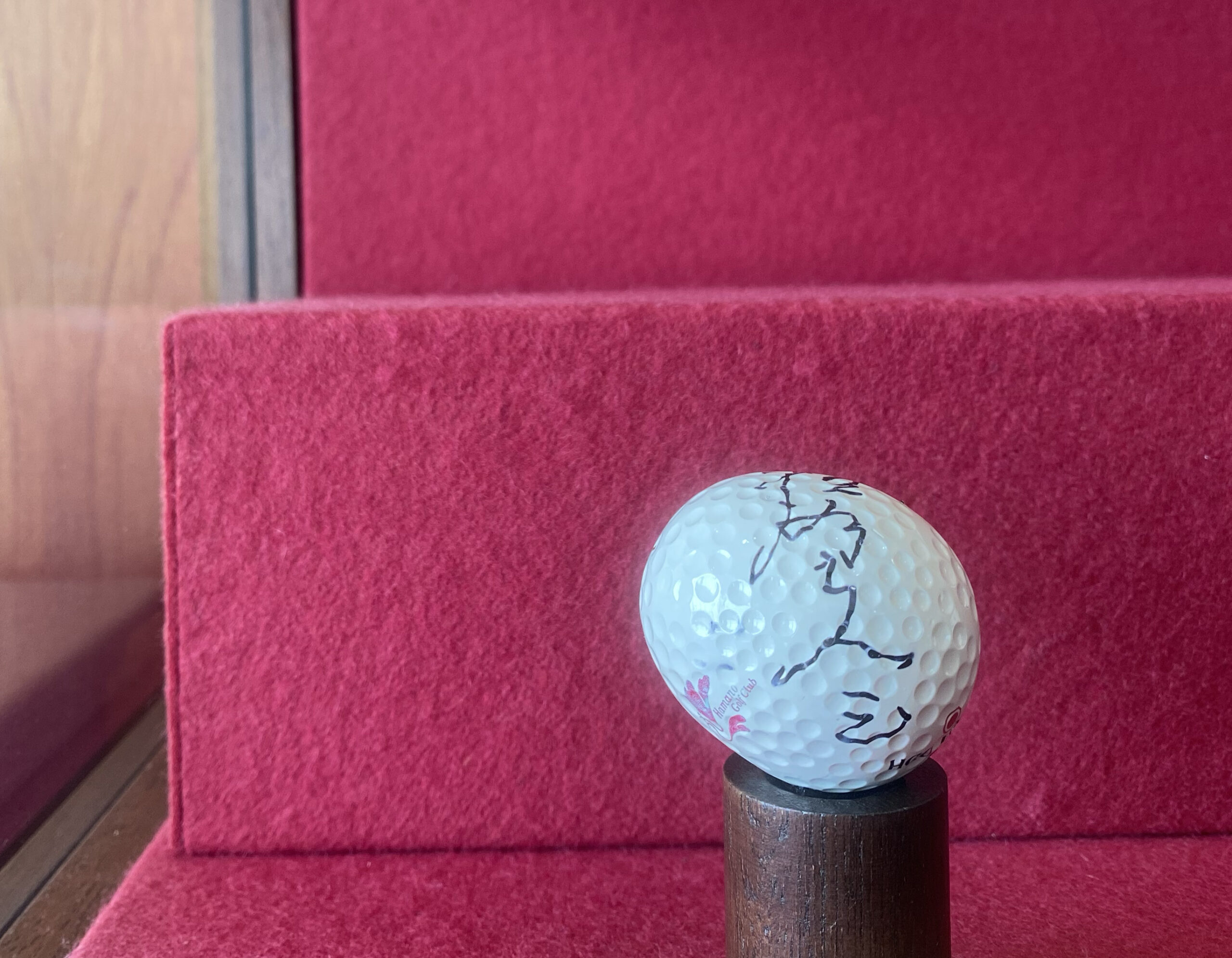 鳥のたまごのような楕円形をしたゴルフボールが飾ってありました。これは浜野ゴルフクラブ(千葉県)の開場時(1984年12月22日)、始球式セレモニーにて使用されたボールの一つです。つまり41年間、コンペルームのケースの中で時を過ごしてきたわけです。
