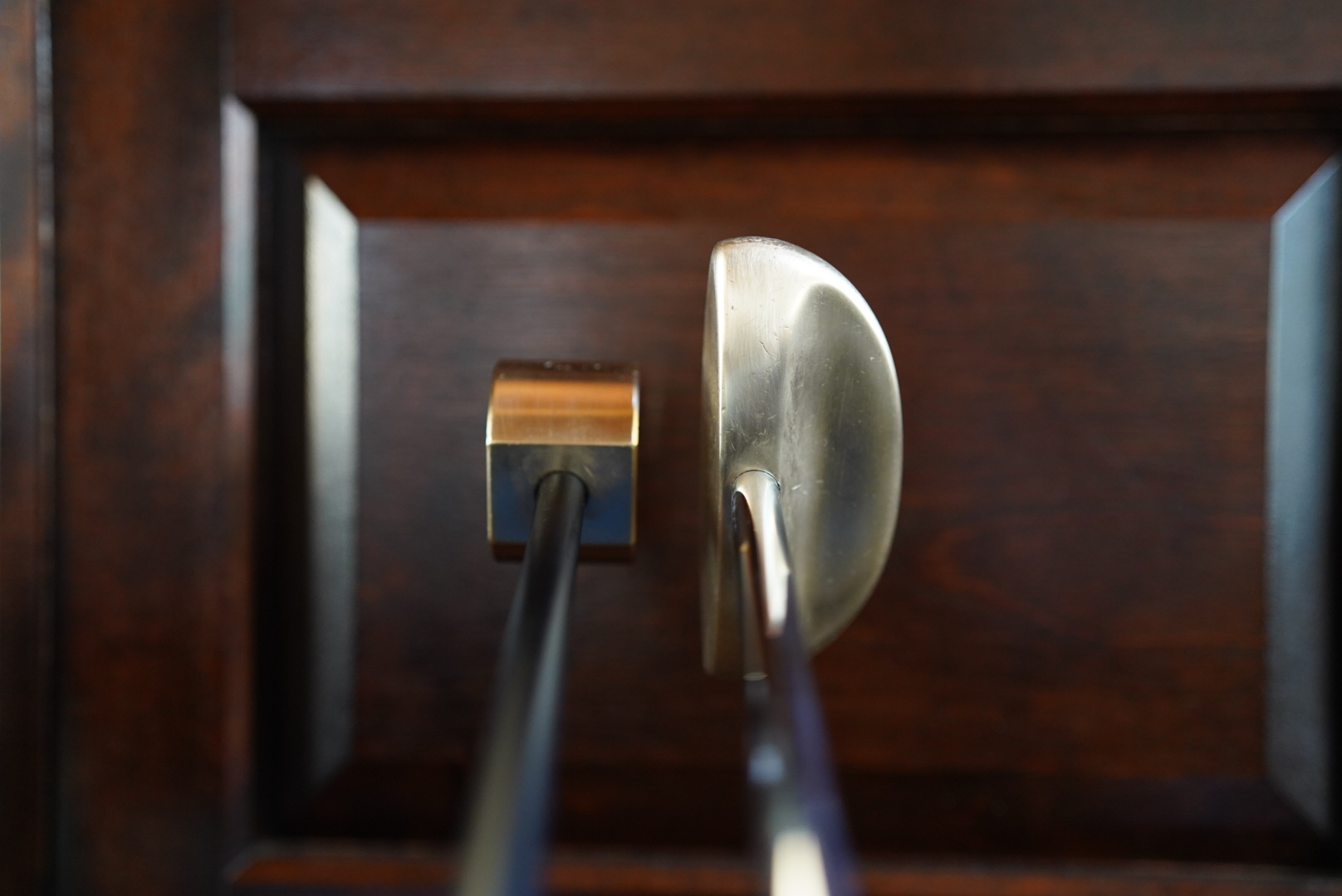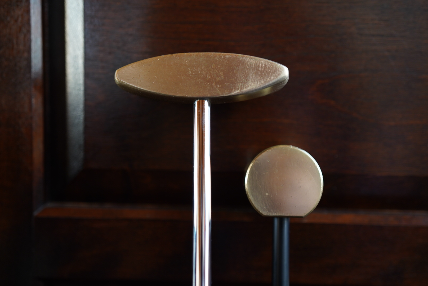小さい真鍮の塊のような「BUTUGU」(写真左)をハンマーで叩いて扁平にしたようなマグレガーのサイドサドルパター「308」(写真右)。見え方としてはフェース面が広がってやさしい印象になっただろうか。また、シャフトの付け位置もフェース際に寄っているため、ヘッド後方が重たい感じになっている。構えやすいが、現代風にいえば「トルク感」が増した状態だ。