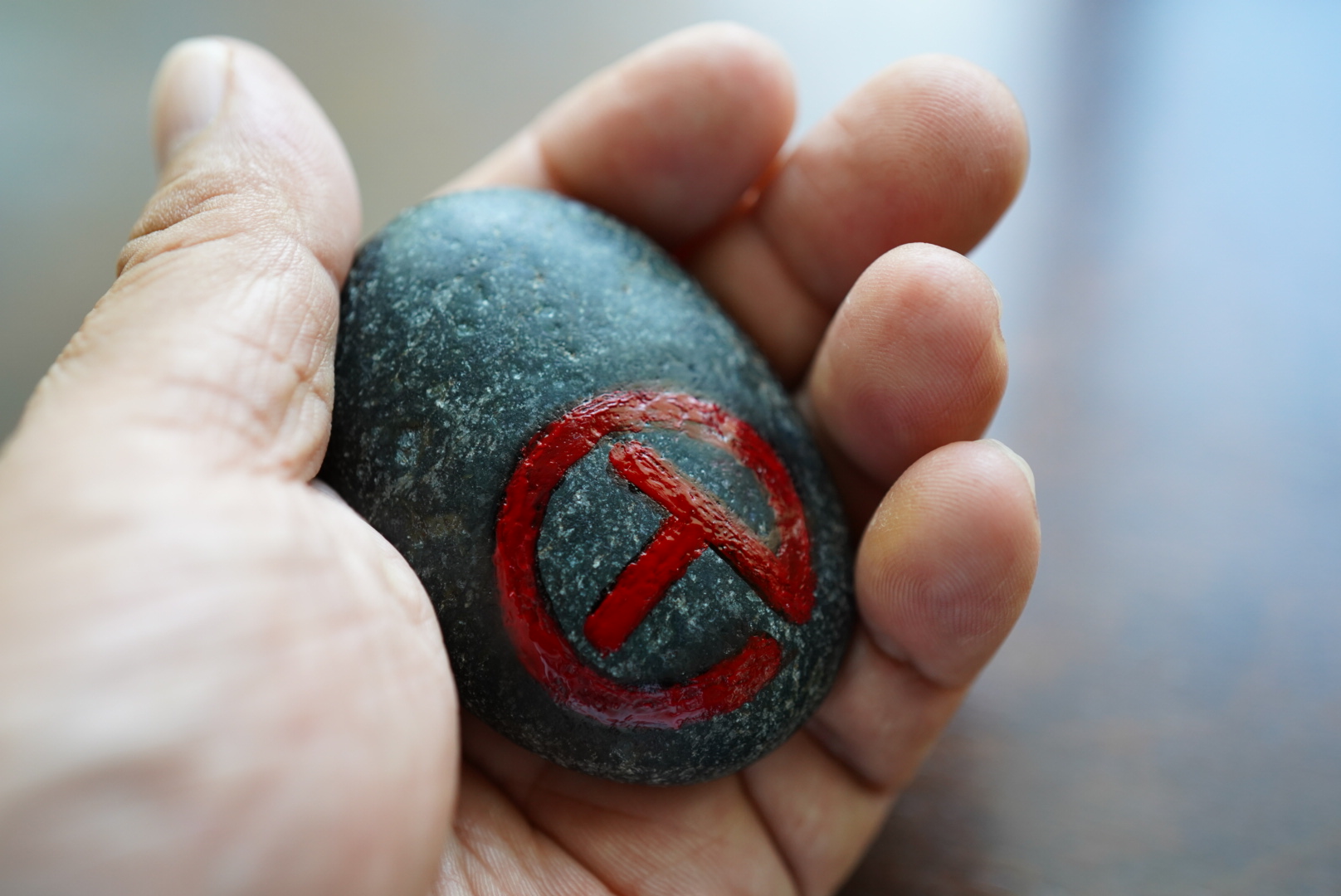 現場にて「この石、写真を撮っていい?」と聞いたが答えは「No」。そう、スタジオの中は基本的には撮影NGなのだ。だから今回は仕方なしに日本の海岸で拾ってきた石に、サークルT を描いて写真を撮って載せた。あくまでもイメージとして見ていただきたい。ちなみにスタジオで見た石はもう少し厚みがあって真円に近かったように記憶している。手描きのサークルTの出来栄えは、たぶん私の方が上である(笑)